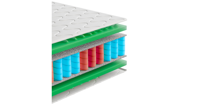 Memory dopasowuje się do ciała i redukuje nacisk. Sprężyny zapewniają stabilność i przewiewność.